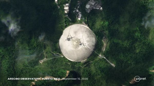Arecibo radio telescope, damaged beyond repair, seen from space