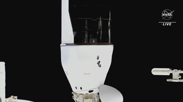 Closing out an automated 18-hour rendezvous, a SpaceX Dragon cargo ship loaded with 7,000 pounds of supplies and equipment, including two add-on roll-out solar blankets, caught up with the International Space Station early Tuesday and moved in for a problem-free docking. Flying through orbital darkness 270 miles above the southern tip of South America, the unpiloted Dragon, launched Monday from the Kennedy Space Center, approached the lab from behind and below, looping up in front of the station and then on to a point about 600 feet directly above the forward Harmony module’s space-facing port.