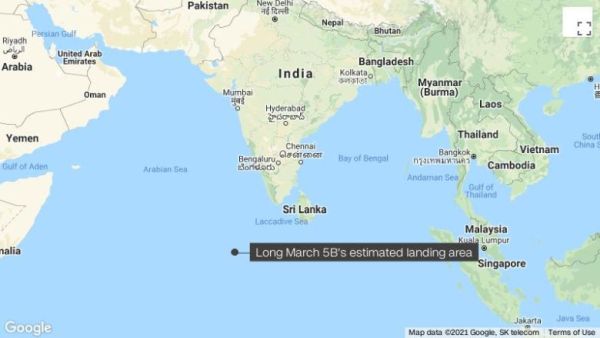 An out-of-control Chinese rocket plunged out of orbit Saturday night ET and reentered Earth's atmosphere, according to China's space agency. The Long March 5B carrier rocket had an estimated landing area of 72.47°E longitude and 2.65°N latitude, just west of the Maldives in the Indian Ocean, China's National Space Agency said in a post on WeChat. Most of the rocket was "destroyed" on reentry to the atmosphere, the space agency said.
