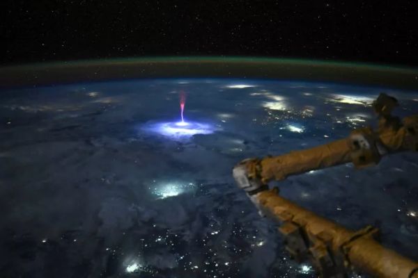 A picture snapped from the International Space Station (ISS) by NASA astronaut Nichole Ayers has captured a lesser-seen view of an extraordinary atmospheric phenomenon known as a red sprite. The photo, taken from orbit during the night, shows a glowing bluish-purple halo with a vivid red column shooting upward into space.