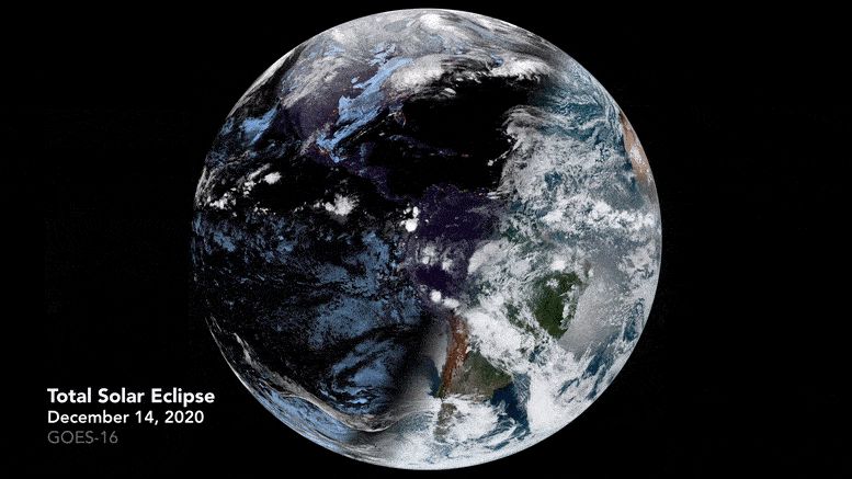 The first and only total solar eclipse of 2020 occurred on December 14, with the path of totality stretching from the equatorial Pacific to the South Atlantic and passing through southern Argentina and Chile. The Advanced Baseline Imager (ABI) on Geostationary Operational Environmental Satellite 16 (GOES-16) captured images of the shadow of the Moon crossing the surface of Earth.