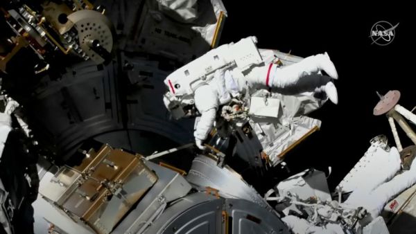 NASA astronauts replace faulty space station antenna during spacewalk