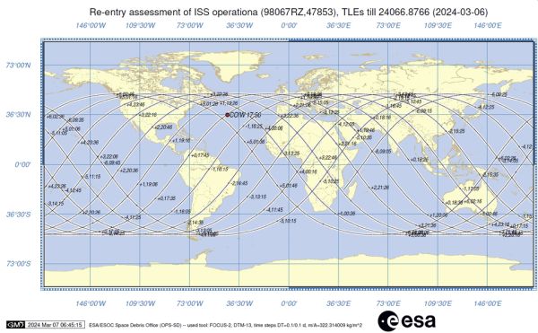 The European Space Agency (ESA) Space Debris and Independent Safety Offices are closely monitoring the reentry of a pallet of used ISS batteries and calculating estimates for when and where the reentry will occur. The batteries, nine in total, were released on 11 January 2021 and will undergo a natural reentry, which is now predicted for around 18:56 CET on 8 March +/- 0.4 days.