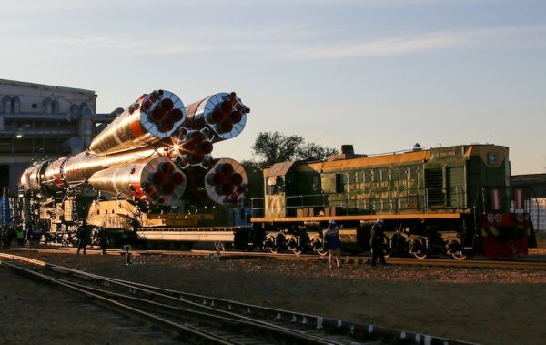 A Russian Soyuz booster arrived at its launch pad on the Kazakh steppe Sunday, the last stop before liftoff Wednesday with a three-person crew bound for the International Space Station. The Soyuz-2.1a rocket emerged from its assembly building at sunrise Sunday for the railroad trek to pad 31 at the Baikonur Cosmodrome in Kazakhstan. After the Soyuz reached the pad, hydraulic cylinders raised the three-stage rocket vertical and gantry arms folded into position around the launcher.