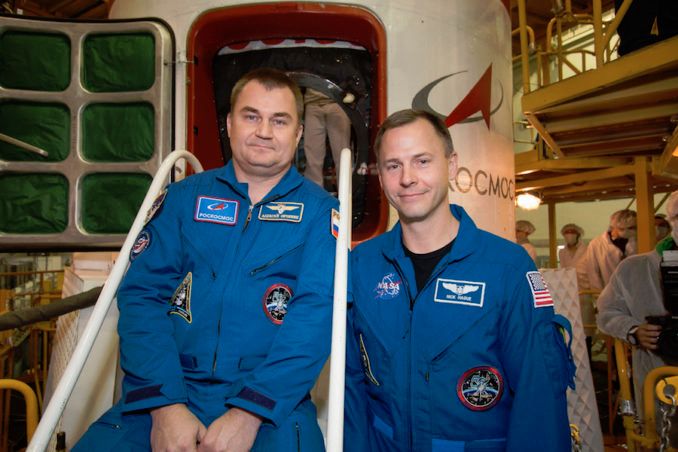 One week after a Russian Soyuz spacecraft departed the International Space Station and brought three crew members back to Earth, another Soyuz carrying a veteran cosmonaut and a first-time NASA flight engineer is ready for launch Thursday on a quick four-orbit flight to the orbiting lab complex. Commander Alexey Ovchinin and flight engineer Tyler “Nick” Hague are scheduled to blast off from the Baikonur Cosmodrome in Kazakhstan at 4:40:15 a.m. EDT (GMT-4; 2:40 p.m. local time), roughly the moment Earth’s rotation carries the Soyuz MS-10/56S spacecraft into the plane of the space station’s orbit.