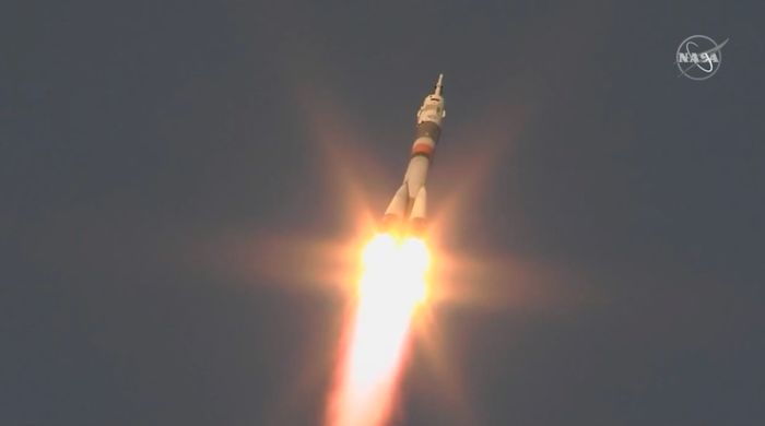 A Soyuz FG rocket thundered to life and shot into orbit smoothly Monday carrying three crew members on a six-hour flight to the International Space Station. The problem-free ascent came less than two months after an Oct. 11 launch abort that forced a different crew to carry out safe-but-scary emergency landing. That mishap was triggered when one of four strap-on boosters failed to separate cleanly two minutes after liftoff. But this time around, all four rockets separated as expected from the second stage core booster and the Soyuz crew ship slipped into its planned preliminary orbit eight minutes and 45 seconds after liftoff.