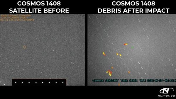 Pieces of a shattered Soviet-era satellite are visible in new telescope images after its destruction by a Russian anti-satellite weapons test on Monday (Nov. 15). The images were captured by Numerica Corp., a Colorado-based company provides tracking of space debris objects, and shared by the company's partner Slingshot Aerospace on Twitter. They show images and video of the debris in the wake of a direct-ascent anti-satellite test by Russia Monday that sent a missile from the ground to destroy a defunct satellite called Cosmos 1408.