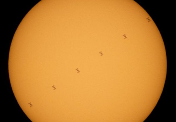 Moving at eight kilometers (five miles) per second, the International Space Station (ISS) circles our planet every 90 minutes. In a 24-hour period, crew members on the ISS experience 16 sunrises and sunsets. Despite how often the station passes directly between Earth and the Sun, capturing an image of the ISS transiting our nearest star is rare.