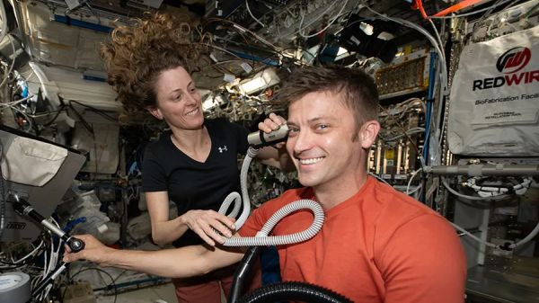 Astronaut Matthew Dominick receives a haircut from astronaut Loral O'Hara. Astronaut Matthew Dominick receives a haircut from astronaut Loral O’Hara. Ten crewmates now reside aboard the International Space Station after the arrival of the Soyuz MS-25 crew ship on Monday. They will live and work together the next several days before returning to a seven-member crew again and beginning the Expedition 71 mission in early April. NASA astronaut Tracy C. Dyson arrived at the orbital lab on Monday with Roscosmos cosmonaut Oleg Novitskiy and Belarus spaceflight participant Marina Vasilevskaya. Dyson will stay in space for about six months as a member of the station crew.