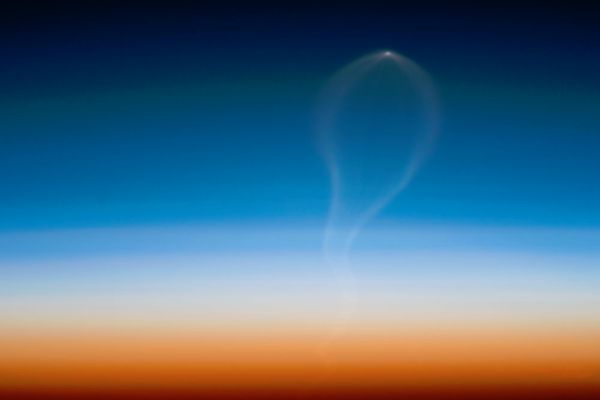 No, this isn't photographic proof of angels. It's actually something even cooler: an Atlas V rocket carrying an uncrewed Cygnus capsule, blasting off into space on December 6, 2015, as seen from the view of an astronaut aboard the International Space Station. The rocket is the tiny point at the top of the image, and the white tendrils trailing from it are exhaust plumes from its engine. About two-and-half days after this photo was taken, the Cygnus docked with the station and dropped off 7,745 pounds of cargo.